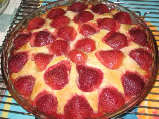 Now, to eat your way down, try this easy recipe. It’s from a charming little cookbook called Strawberry Patchwork by Susan A. McCreary, a local Herndon author. The cobblecake is a good brunch cake — down-to-earth, homey, unpretentious. You simply pour the batter into a greased pie plate, and arrange the strawberries on top, like this: