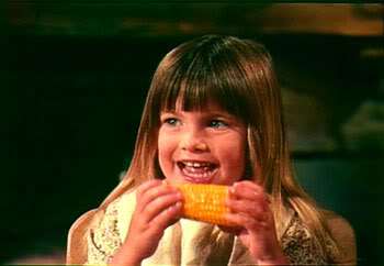 Seeing the episodes over and over through the years has frozen all the characters in time for me. Carrie will always be under the age of 10, a freckly-faced, brown-haired, blue-eyed cutie, frolicking in the meadow with her sisters, clutching her rag doll, and smearing her face with raspberry juice. My favorite Carrie moments just happen to center around food: making apple fritters and frosting a chocolate cake with Ma, tasting a giant strawberry with her imaginary godsister, Elissa, expertly polishing off an ear of corn, and smearing stew on Mr. Edwards’ nose.