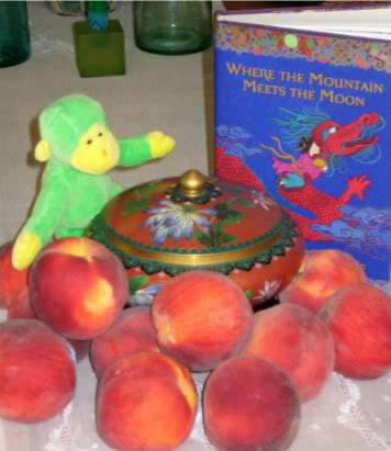 It all started when Noodles the Monkey found the big stash of peaches used to celebrate Grace Lin’s new book, Where the Mountain Meets the Moon.