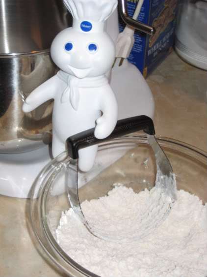 Meanwhile, a chubby sous chef made the topping by cutting butter into flour and brown sugar.