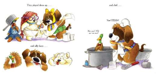 Everyone here at alphabet soup couldn’t be happier, cause we’re all quazy about Max, Brody, Dakota, Bebe and the whole raucous menagerie living at Irene’s. Seems like just yesterday we first heard Max knocking on Irene’s door (Duck at the Door, 2007), seeking shelter one winter’s day after the rest of his flock migrated South. Once he learned to use the remote control, discovered his flair for cooking, and made himself happily, quackily at home, he endeared himself not only to Irene and her resident dogs, cats, birds and rabbits, but to readers all over the world.