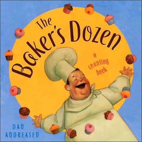 THE BAKER’S DOZEN: A Counting Book by Dan Andreasen (Henry Holt, 2007). A jolly, red-cheeked, roly poly baker serves up a bounty of heavenly sweets from 1-12 in this rhyming counting book. His joy is contagious, and Andreasen’s retro-style oil paintings capture every bit of the baker’s glee as he “takes great care to make one cream éclair,” “bakes two German chocolate cakes,” and “in tins the perfect size he bakes three cherry pies.” He balances pies on his fingers and toes, draws doodles on top of strudels, juggles cupcakes, and then greets 13 lucky customers at the door. Cherry Pie lover Andreasen tops off this visual feast with a number graph displaying the complete menu of delectables. Nom to the nth power.