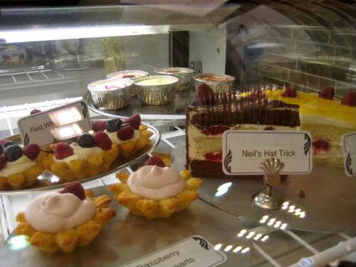 You try to avert your eyes, but pretty little chocolate-dipped strawberries, good-sized eclairs, brownies and cookies, and some decidedly intriguing cupcakes, obviously pleased with themselves, beckon in voices alluring and hypnotic.
