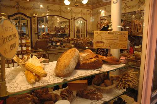 I can remember the first time I went to Jean-Luc Poujauran’s bakery sometime in the 1980’s. I was staying at the other end of Paris, but I made the pilgrimmage happily because I’d heard so much about this young baker. What I hadn’t heard about, and what made me smile with a girlish ear-to-ear grin, was how completely winning the little shop is. Tiny and painted in Provençal blue and cotton-candy pink, it is the kind of shop that makes even grown-ups want to press their noses up against the windowpanes — and many do.