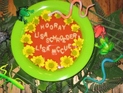 Now, please help me congratulate Lisa and Lisa, because today is their BIG DAY! The alphabet soup kitchen helpers traveled to the deepest part of the jungle to gather the ingredients for today’s celebration soup. Just so happens it took them a tad longer than usual to complete their work because they were so busy riding on hippos taking notes about all the fascinating things they saw. Feel free to jump right in, splash around, and croak your good wishes. For today only, activities such as flipping, flopping, slipping and dropping are highly encouraged.