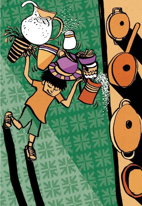 Vilela’s vibrant folkloric illos, rendered in a palette of teal/grey/greens and spicy warm rust/oranges, amplify the joyous spirit of this heartwarming mother and son culinary adventure, perfectly illuminating Argueta’s magical realism. Amid the fragrant ribbons emanating from the kitchen and ultimately drifting off into the world, the young chef has conjured up an irresistibly enticing paean to his favorite pudding — a wonderful celebration of food, family, sharing, and budding independence.