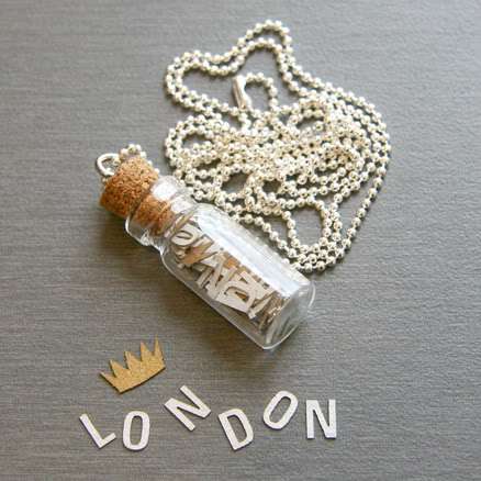 Love these necklaces created by collage illustrator Laura Tarrish of Bridgetown Papers in Portland, Oregon. The little bottle is filled with tiny custom letters cut from silver card stock.