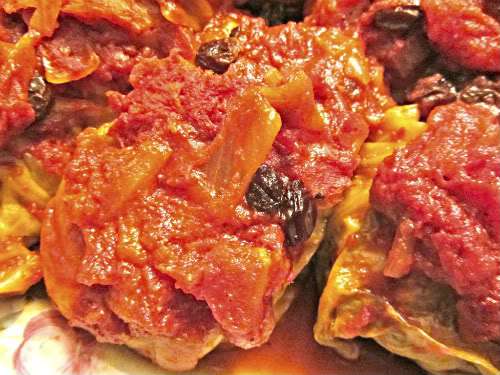 Spread a covering layer of sauce on the bottom of a large baking pan. Once cabbage leaves are towel-dried, lay them flat, inner side of curve facing up, and (with gloves still on or a new pair) scoop up enough meat to allow leaves to fold, from core side to opposite side; then fold other sides in. Lay each piece, folded side down, in the pan, making only one layer of cabbages. Spread sauce on top of the cabbages, sprinkle with brown sugar and ½ cup of raisins, cover tightly with aluminum foil, bake at 325 degrees Ffor three hours. Remove from oven and cool in refrigerator. Serve the next day or freeze.