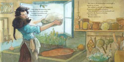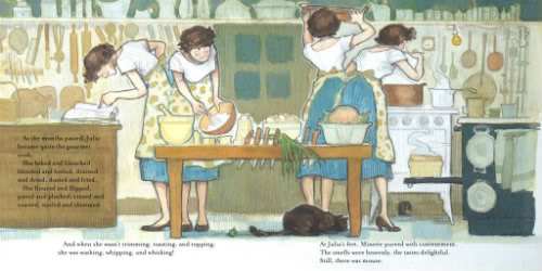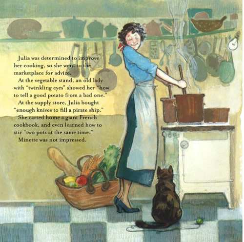 Susanna, with her perfectly seasoned, lyrical text (“she baked and blanched, blended and boiled, drained and dried, dusted and fried”), and Amy, with her cozy-warm, evocative pencil and watercolor illos, have beautifully captured Julia’s energy and zeal, Minette’s pampered puss impishness, Paul and Julia’s mutual affection, and the romantic ambiance of late 40’s Paris.