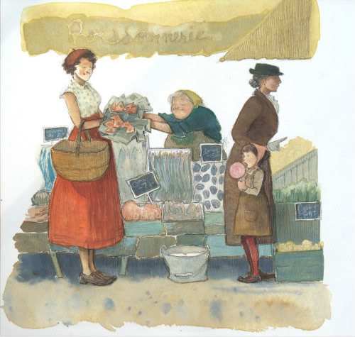 I love Amy’s illustrations and was thrilled to be shown sketches early on so that we could confer about historical accuracy. What I love best is the way she captures the characters’ emotions and relationships. My favorite spread is the one with Julia and Paul standing in front of their apartment building. On the right-hand page, Julia cradles Minette in her arms while Paul chucks her under the chin, and on the opposite page there are two pigeons perched on a windowsill. The figures of Julia and Paul are so expressive, and the pigeons give the spread a visual and psychological balance. You can practically hear the cooing coming from both the people and pigeons. And the colors—soft blues and greens against the creamy background of the building—are just beautiful.