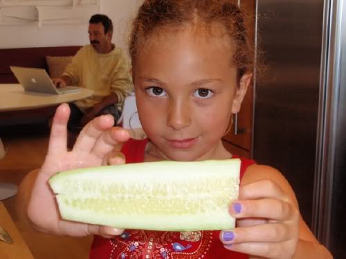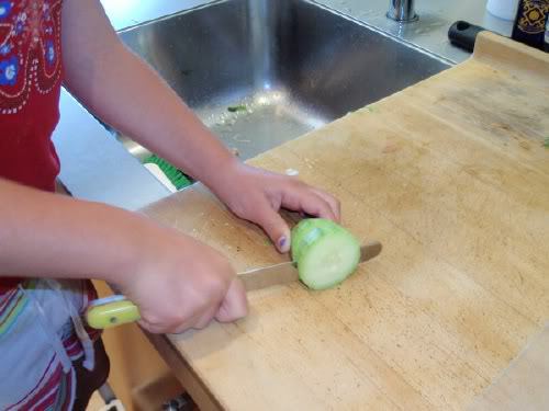 Peel the cucumbers. Cut 18 to 24 paper-thin slices and reserve in a bowl for later. Cut the rest of the cucumbers into half-inch chunks: you will have about 4-1/2 cups.