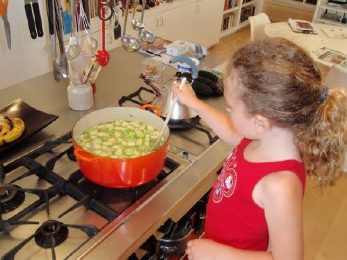 I made a few test batches, purchased attractive little containers for each ingredient, and memorized facts about cucumbers, shallots, chicken broth, etc., so I could keep up an entertaining banter while I sliced and diced. Did you know that the earliest literary reference to cucumbers is in the Epic of Gilgamesh, from 2500 B.C.? The day before the demo, I shopped for ingredients and cooked enough soup for 75-100 people to sample. My friend’s six-year old daughter was my sous-chef, so now I know a 6-year-old can make the recipe (with a little help). The demo went really well, and the soup was a big hit with the librarians.