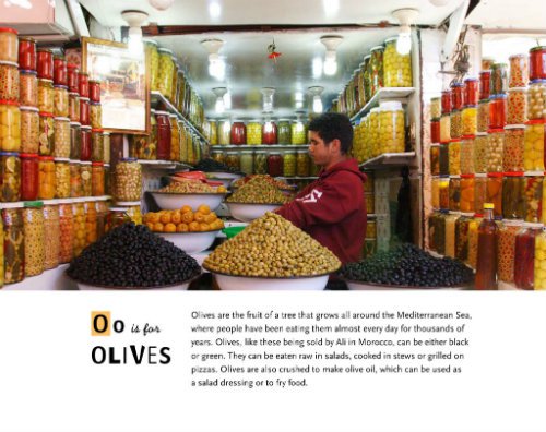 Caldicott uses single photos or photo collages for each letter of the alphabet to showcase a specific food or food-related essential (journeys, kitchens, markets, quantities), paired with a concise paragraph describing how the food is commonly eaten, obtained, processed and/or prepared. He also unobtrusively slips in a nod to healthy eating habits (the value of fresh fruit and veggies, or honey over refined sugar, etc.). The emphasis is on whole foods, fair trade, sustainable crops, and conservation.