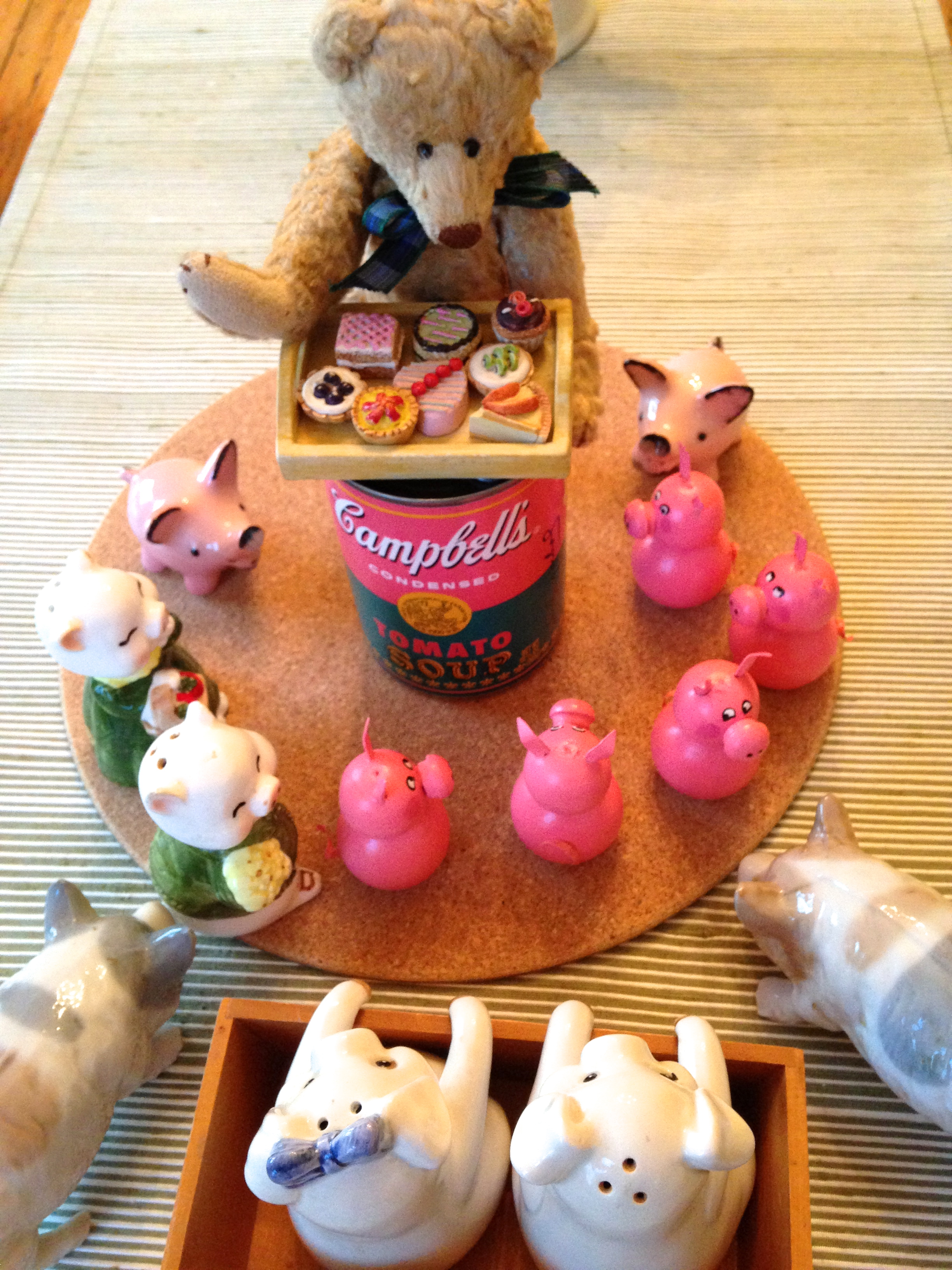 1. Those pig salt and pepper shakers come in handy when we have dinner guests. Each gets his own pair as part of his table setting.