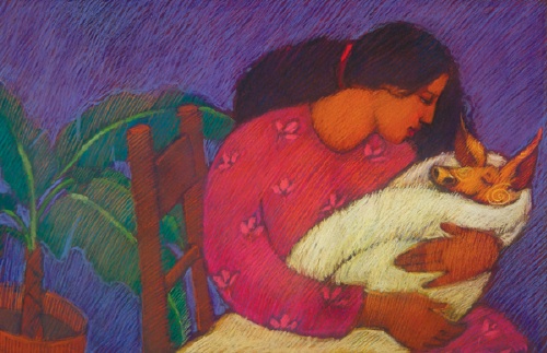 I love the pairing of Lindy Shapiro’s lyrical, poetic narrative with Kathleen Peterson’s highly evocative, color saturated spreads rendered in rich jewel tones. Here is a universal theme presented with a distinct Hawaiian flavor, illuminating the lush, natural beauty of the islands and the spirituality and animism characterizing the native peoples.