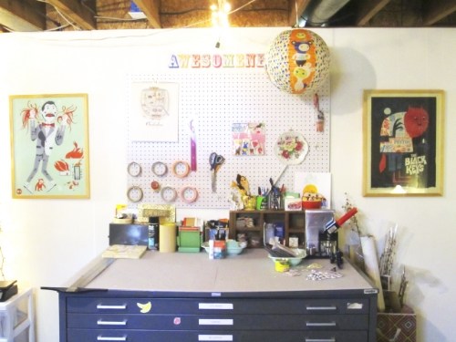 I love working to music. We space for specific projects. The flat files is where we cut etsy prints and make buttons. My drafting table is where I paint. I have a computer space and also a sewing table now.