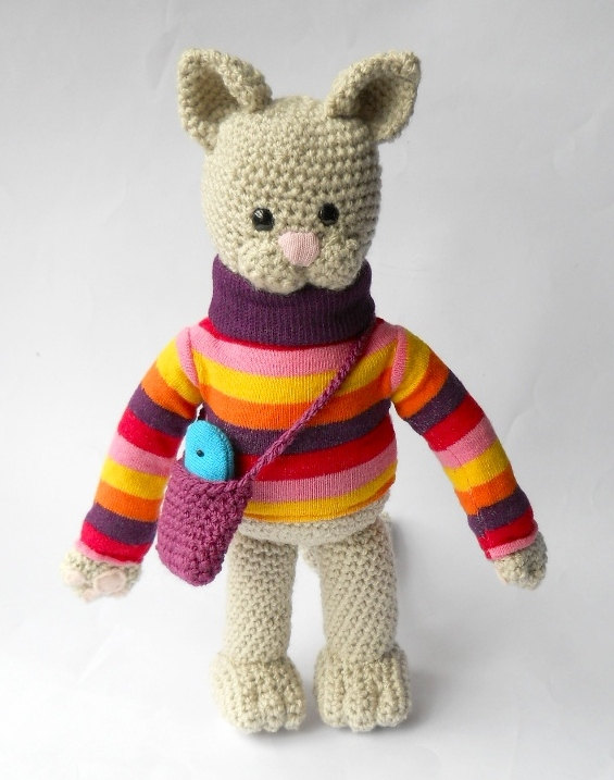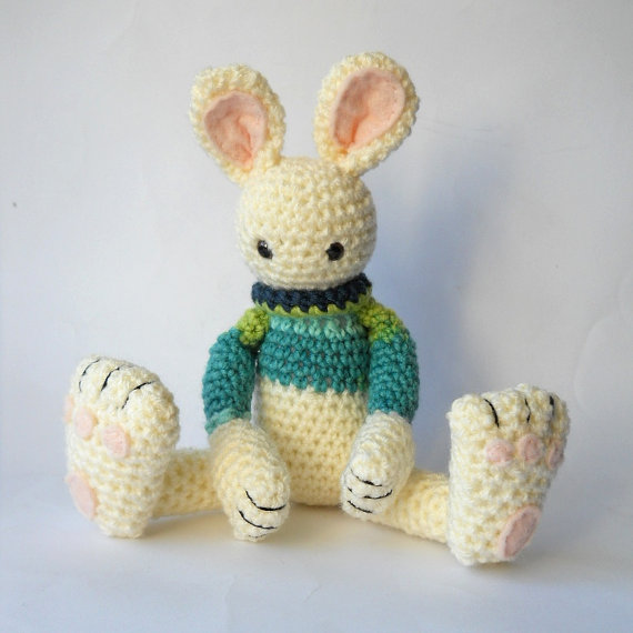 I discovered he was created by plush artist Dawn Treacher of York, England, who designs and makes other Amigurumi animals like the bear, in addition to a wide range of sock animals, fleece plushies, and soft sculptures. Some of Dawn’s creatures are inspired by real animals (foxes, bunnies, giraffes, elephants, badgers, birds), while others represent wild flights of the imagination — brightly colored alien one-eyed monsters in odd shapes with elongated ears and limbs.