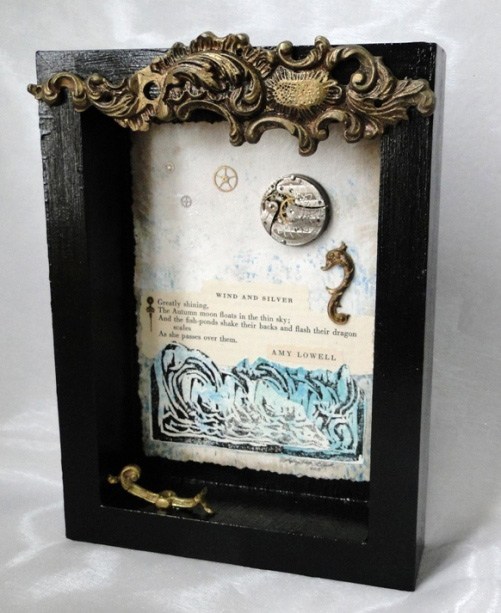 Since my favorite thing is always what I’m working on at the moment… I was recently asked by a poet friend to make a mixed media piece as a birthday gift. My friend and I had enjoyed the harvest moon together, and since the recipient has a fall birthday, I knew when I found a short Amy Lowell poem called “Wind and Silver” in a 1928 anthology that I wanted to use it. It can take me a long time to find the right words and elements for a piece.