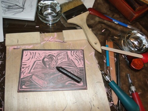 Printmaking definitely challenges the control-freak aspect of my personality, because the results can be serendipitous! I start with a pencil drawing on thin paper (love my Ebony pencils), then lightly coat the finished sketch with graphite to transfer it onto a block of wood or a carving block (softer to cut and easier on the arm and hand). I simply sketch over the lines from the reverse side, and the graphite transfers the sketch in onto the block.
