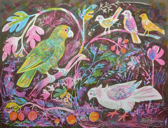 Mark is a Yorkshire native who studied illustration at the Glasgow School of Art and Natural History illustration at the Royal College of Art. He works across a variety of mediums, producing unique paintings, linocuts, lithographs, cut-paper collages, hand-painted ceramics, wallpaper and fabric designs.