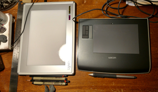 Tools of the trade: Wacom tablet and light table, and paint tubes mounted and organized on a board.
