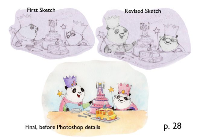 I always start a sketch on loose copy paper. The sketching part is my favorite! Then I scan it into Photoshop where I can clean it up and move things around if I want. After sketches were approved I used my light table to transfer them in with a micron pen onto Arches watercolor paper. Then they’re scanned again and I can make small adjustments needed in Photoshop.