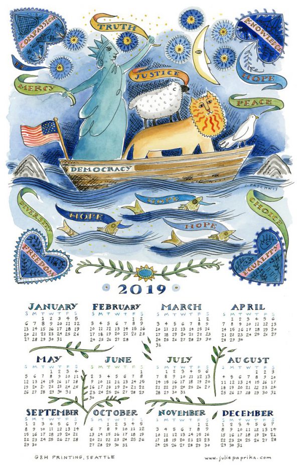 3. Heads up, Julie Paschkis fans!! She has created another gorgeous calendar to benefit the ACLU. HOPE 2019 is a one page poster (11″ by 17″) printed on heavy stock. The watercolor and ink drawing celebrates the values of the United States, and shows the struggle to preserve them. Each calendar costs $12: the entire $12 for each calendar sold goes to the ACLU. Get yours at Julie Paprika.