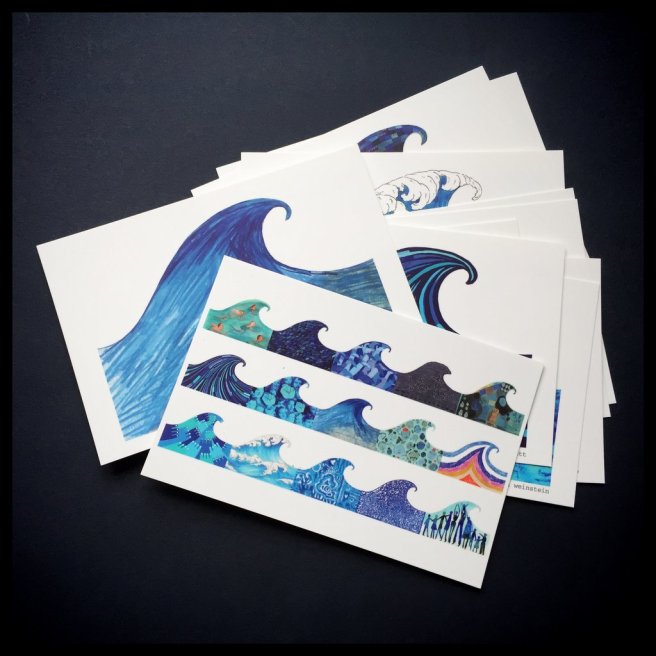 They’ve created original blue waves to help turn the tide. You can support their efforts by purchasing original blue waves, postcard sets, pins, or t-shirts. All proceeds will be donated to VoteRiders.org and Emily’s List, an organization dedicated to electing pro-choice Democratic women to office.