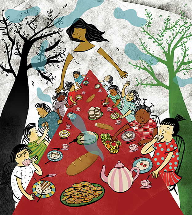 The poets were paired with illustrators of similar backgrounds, who did a beautiful job of interpreting the poems in unique styles informed by their own personal histories. Julie Downing’s lovely watercolor with its soft edges perfectly complements Jane Yolen’s wistful poem, “Calling Home,” and I love Sawsan Chalabi’s party scene accompanying Naomi Shihab Nye’s “Far, Far Away.”