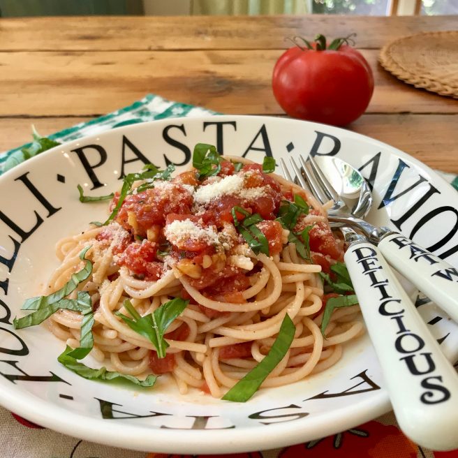 Mr Cornelius grew hungry after hearing about Sonny’s restaurants (no surprise), so we dug up one of his favorite pasta recipes. It’s a very basic fresh tomato sauce with spaghetti. Probably blanching and peeling the tomatoes is the most time consuming part of the recipe. With a good quality olive oil, fresh basil and garlic, you really can’t go wrong. I imagine canned tomatoes would work just fine when juicy summer tomatoes aren’t available. No simmering required, so this one comes together quickly.