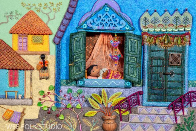 If you’re a Salley Mavor fan, then you know her gorgeous fiber work is without equal. She worked on My Bed for two years, spending about 1-2 months on each scene. She likes to think of her artwork as “miniature shallow stage sets,” and it’s amazing what she creates with fabrics, beads, wire, woods, yarns, threads and found objects. The detail is exquisite, from each meticulously painted character face to the hand-stitched lettering on the front cover.