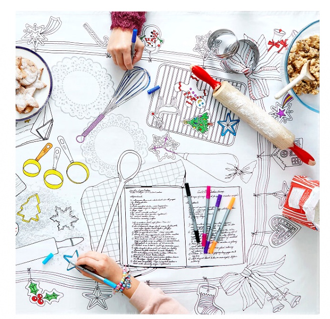 6. Here’s a fun way to get young ones into the holiday spirit and keep them busy while something amazing is baking in the oven: the Christmas Cookie Coloring Tablecloth!