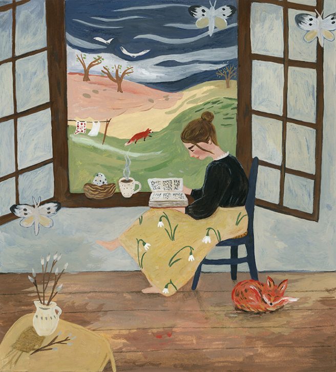 I love the sense of serenity and calm depicted in her domestic scenes, where ordinary activities and family life become a form of meditation. Home is nourishing, pleasurable, and safe — its own world within the world, and her pictures are a good reminder to be fully present in our daily lives. Also cool is that touch of whimsy when the outside comes in. 🙂