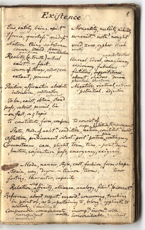 First entry in the first draft of Roget’s Thesaurus (1805). An expanded version was eventually published when he was 73 (Karpeles Manuscript Library).