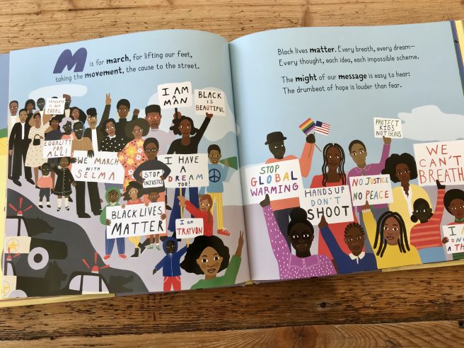 The history of Blacks in America has been a history of protests, marches, sit-ins, and boycotts. For the letter “M,” Cortez’s deftly crafted verse and Semmer’s spirited illustration reference the civil rights and Black Lives Matter movements, climate change, and gun violence, giving young readers an instructive glimpse of historic milestones as well as current, ongoing challenges.