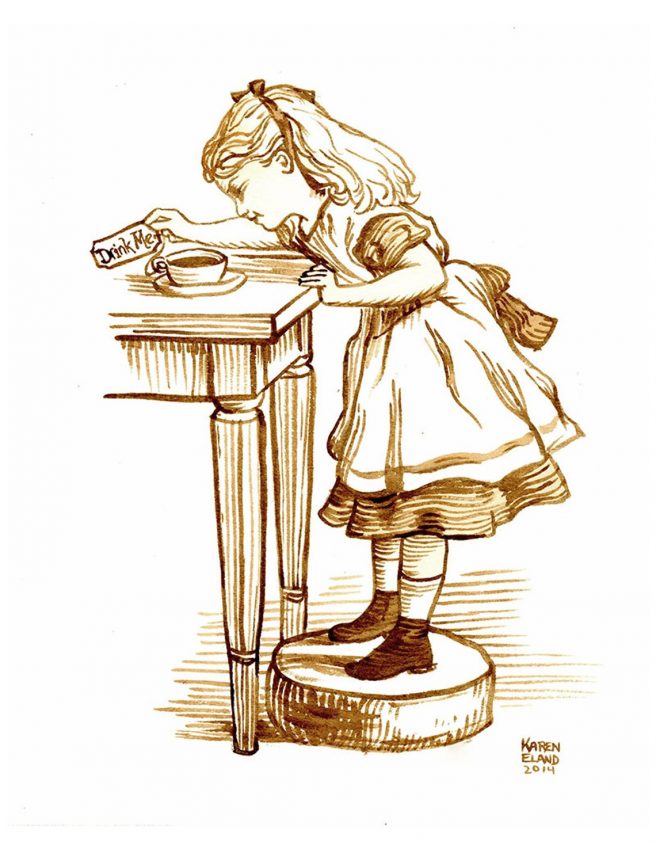 I love that beginning quote by Nanea Hoffman and the creative ideas for her paintings by Karen Eland, Jama. “Drink Me” indeed! Yes, I am a coffee drinker but only in the am, and do go without when I’m in a hurry. My mother, however, all day, in every way. My favorite comes from tasting the delights of coffee from Costa Rica, first with students. And we even visited a coffee farm! Happy fall to you!