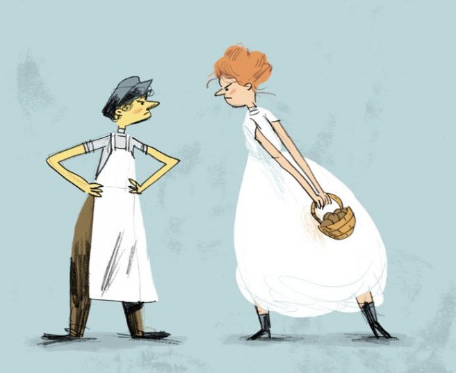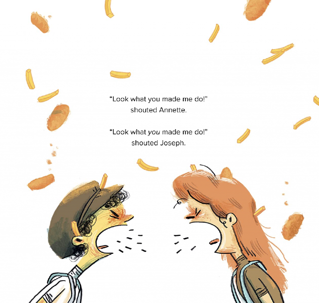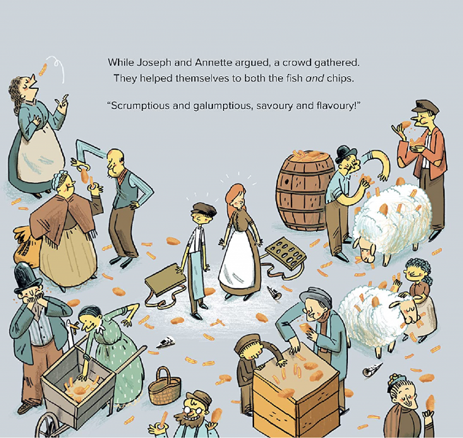 You can guess what happens next. Annette’s fried potatoes (“savoury, flavoury!”) are a big hit, and soon customers are rushing by Joseph to get to Annette. A fierce rivalry ensues as both Joseph and Annette shout even louder to draw customers. Not looking where they’re going, they run right into each other. Disaster!
