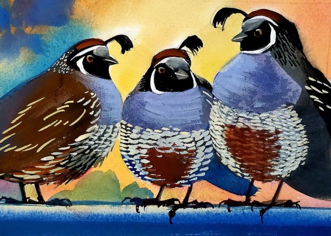 She does a different theme every month. January was “Backyard Visitors,” and for February, it’s “State Birds.” Each original painting is 5″ x 7″, done in gouache and watercolor on 100% rag paper, and sells for $85 including shipping.