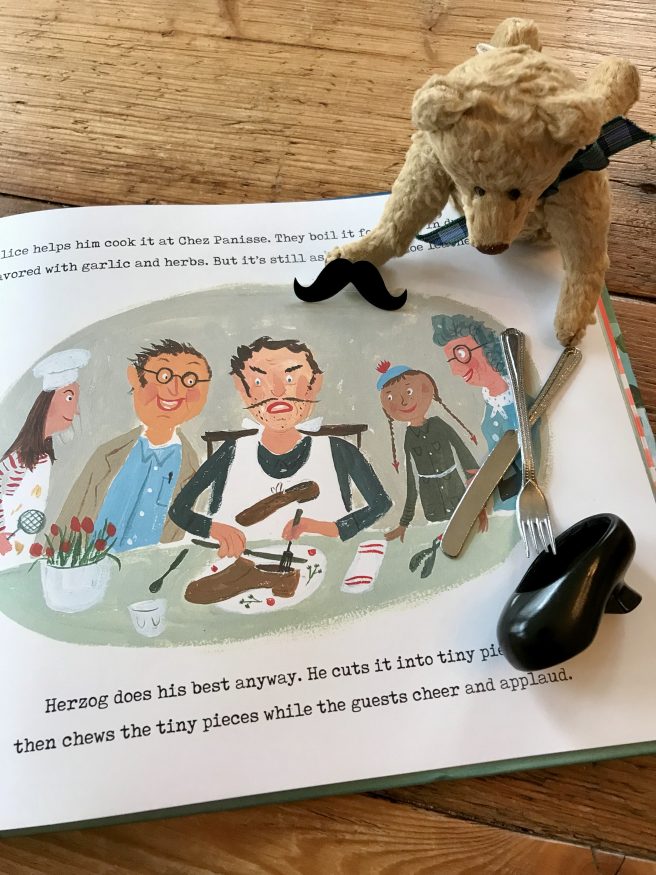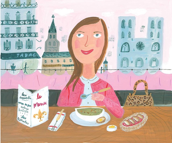 Readers will have a ball pointing to all the delectable food items – fruits, veggies, fish, breads, cheeses, meats, chickens, and eggs – whether they appear on grocery store shelves, dining tables, in gardens or farm market stalls. How wonderful to stroll around Paris with Alice, or hang out with her in the kitchen as she creates mouthwatering dishes for her bohemian friends!