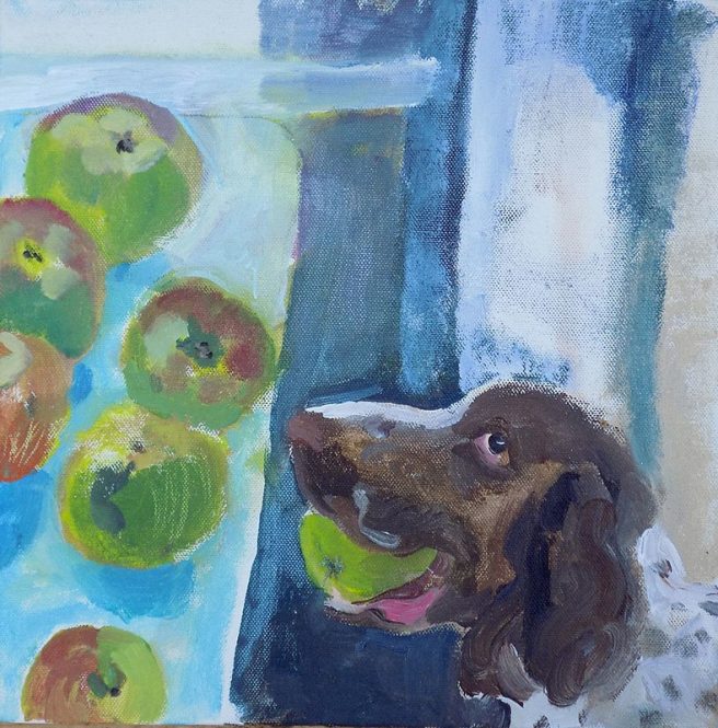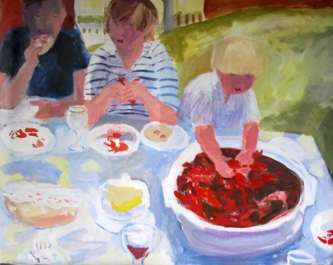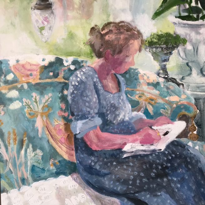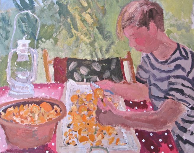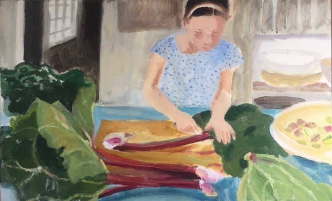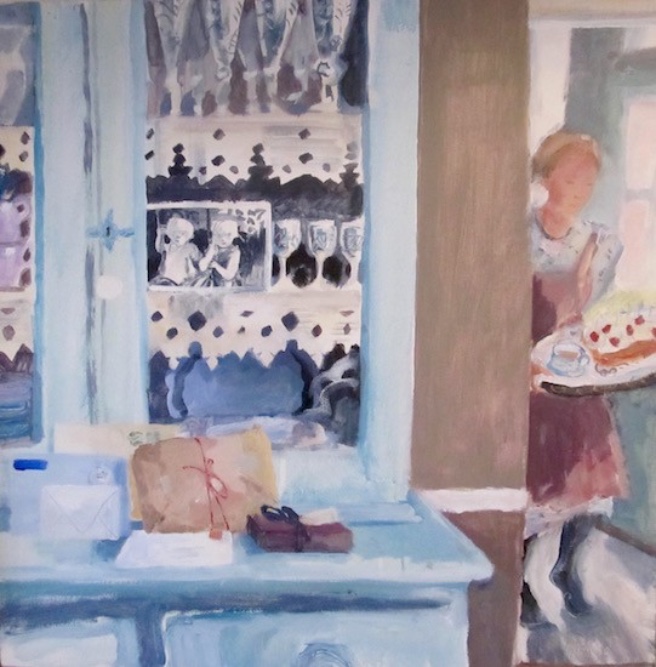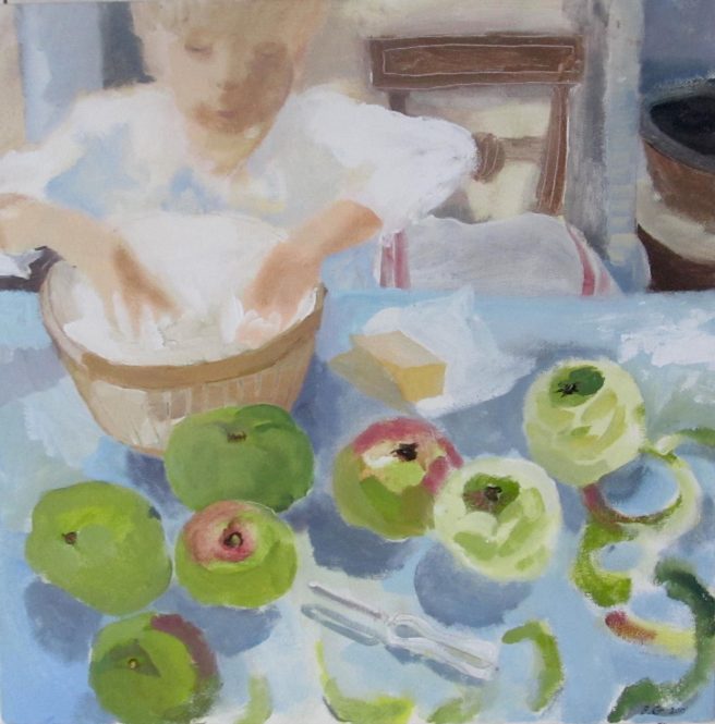 No surprise – I’m totally enamored of her interiors, which depict people engaged in domestic tasks – arranging flowers, cutting rhubarb, rolling out pastry dough, cutting apples, relaxing with a crossword puzzle. Her “soft focus” approach gives her pictures a dreamy, haunting quality that pulls us into her visual narratives. We are witnessing ‘life as it happens.’