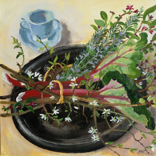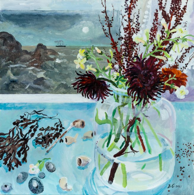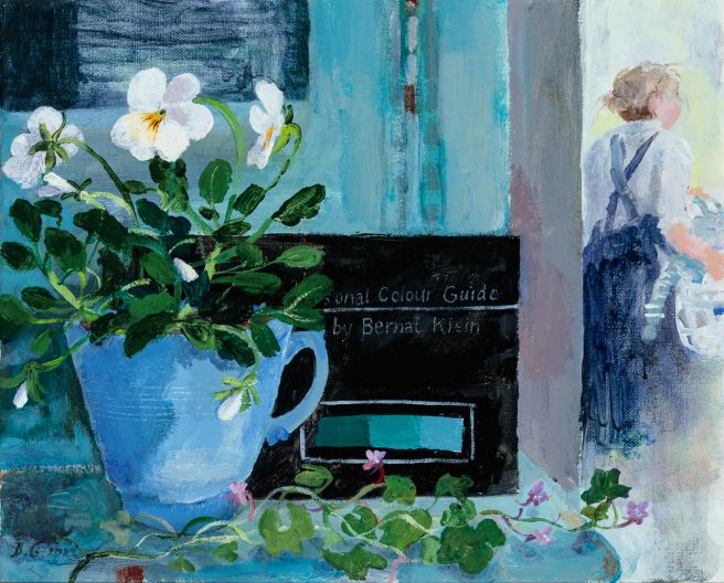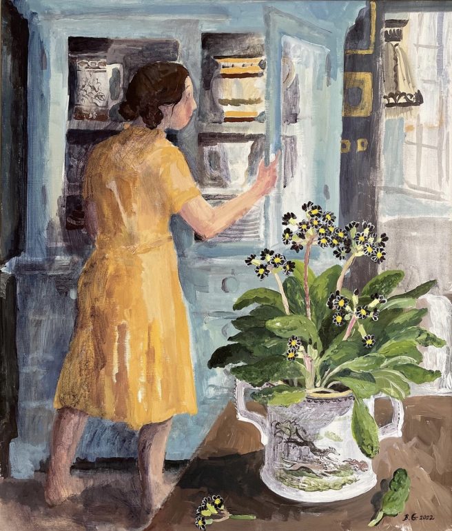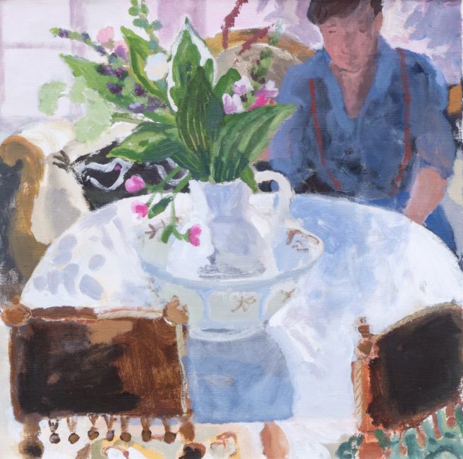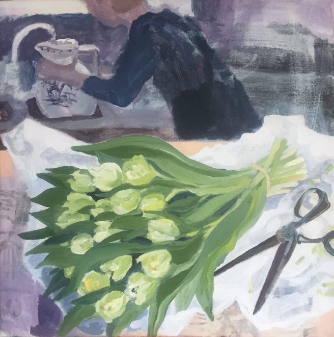 Her lovely still life paintings feature blooming bulbs, wildflowers, and pretty cut blossoms in an interesting variety of receptacles (antique vases, jugs, tins). They all tell an interesting story, as her settings – whether dining room, kitchen, window looking out to sea, sitting room, sideboard – establish a context for chosen objects. I love how she sometimes includes figures (working in the background, reflected in mirrors), suggesting a human presence that arouses curiosity without being intrusive.
