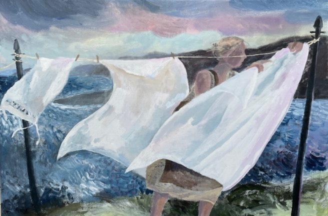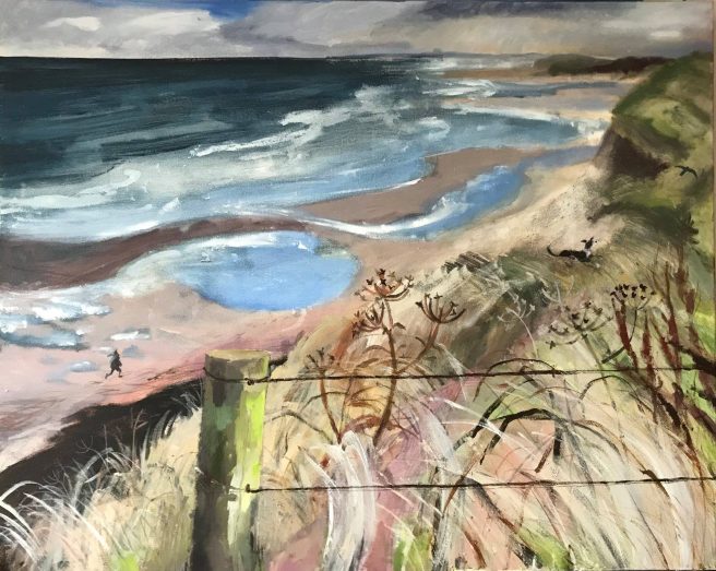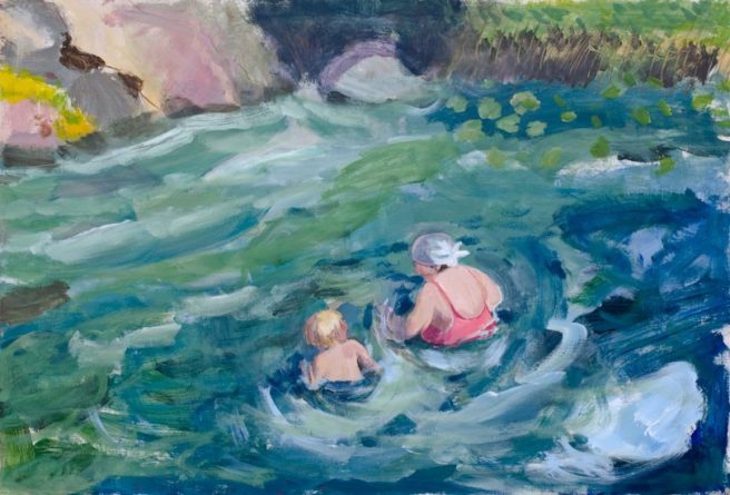 Her landscape paintings have been described as “freer, broader and unconstrained,” with an “adventurous freshness.” I love her sweeping vistas, the feeling of wildness, spontaneity, of the natural world in a state of flux. As with her interiors, she includes people enjoying the outdoors, whether swimming, hiking, or beachcombing. She says that quite often someone might walk into her picture, so she paints him/her in.