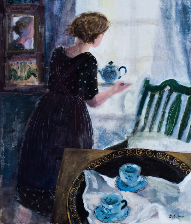 I had to catch my breath the first time I saw Brita Granström’s, “Tea for Two”: the soft light at the window framed by gauzy blue curtains, the expectant posture of the woman looking outside, the gorgeous blue tea set. Love how she captured the ethereal beauty of a fleeting moment in time.