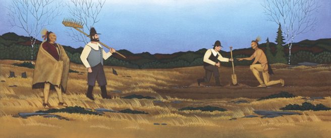 The Three Sisters flourished; by the time fall arrived, Weeâchumun, Beans and Squash “brimmed with food.” The newcomers thanked the First Peoples for their help and prepared “a feast to celebrate their first year in their new home.” After hearing musket fire, Ousamequin and other First Peoples arrived, joining the feasting for three days.