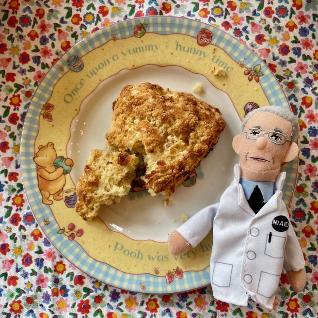 Now about those scones. 🙂 The poet perfected them, just as millions perfected their sourdough loaves. Could I resist making some? Of course not. I just happened to find a recipe online that sounds like the one Judith mentions in her poem. We even invited Dr. Fauci over for old time’s sake. He made sure we washed our hands before starting.