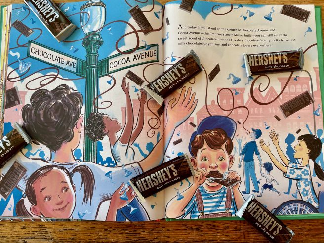 You can see why I was excited to see this brand new picture book biography, On the Corner of Chocolate Avenue: How Milton Hershey Brought Milk Chocolate to America by Tziporah Cohen and Steven Salerno (Clarion Books, 2022). Though a longtime Hershey’s fan, I actually knew very little about the life of America’s Chocolate King.