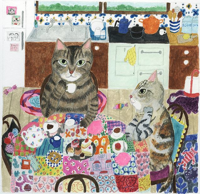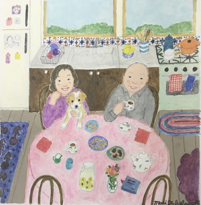 Mari’s illustrations are rendered in pastel watercolors, and are known for their delicate line work and lively patterns. Domestic scenes are graced with patchwork quilts and floral tablecloths, wallpaper and area rugs.