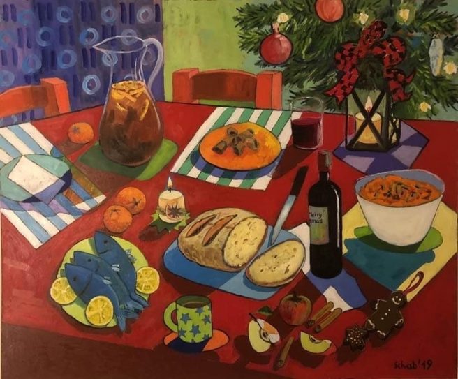 I enjoy feasting on Schab’s pictures – the cups, jugs, fruits, plates, flowers, vases, and cool table linens (diamonds, stars, stripes!). Who could resist a red polka dot coffee pot? And anyone who paints teddy bears is okay by me. 🙂