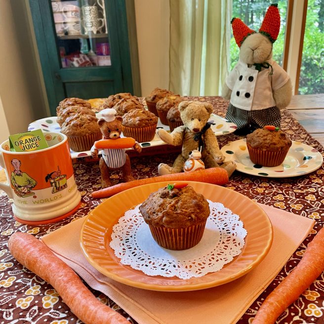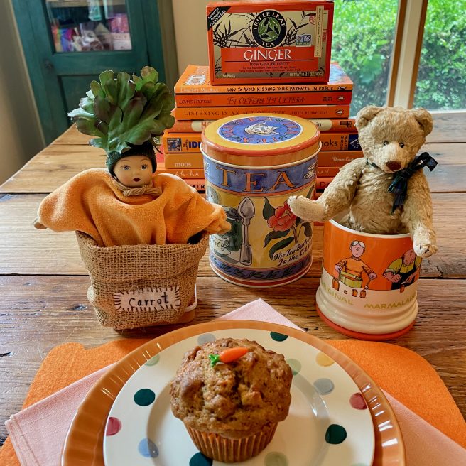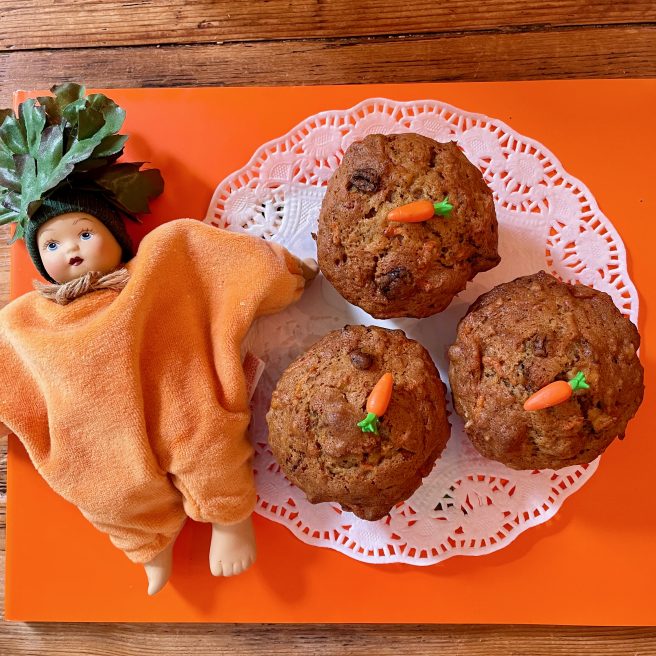 Since Mr Cornelius’s friend Carrot is visiting this week, we made some šŸ„•Carrot MuffinsšŸ„• in her honor. We found the recipe in the Tate’s Bake Shop Cookbook by Kathleen King (yes, she’s the person behind those famous chocolate chip cookies). Chock full of diced apples, nuts, and raisins in addition to grated carrots, these delectable muffins are great for breakfast and perfect for people who like carrot cake but would appreciate something less sweet and guilt inducing without the rich cream cheese icing. We like getting our beta carotene/Vitamin A fix this way too.