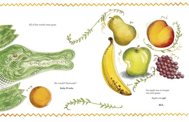 As Zigzag acquires his vowels, one by one, the text reflects this: Glad to get back his a, then eating a tart apple and beaming once he’s also retrieved his e, and so on.